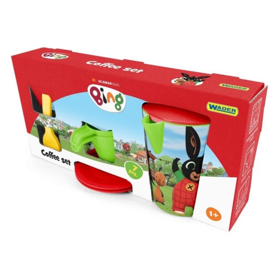 83101 BING ZESTAW NACZYŃ KAWOWY Zestaw naczyń kawowy z wizerunkami bohaterów bajki Bing spodoba się każdemu miłośnikowi zabaw w gotowanie i organizowanie przyjęć i będzie doskonałym uzupełnieniem dziecięcej kuchni. Zestaw składa się z 7 elementów: dzbanka z grafiką IML, 2 filiżanek, 2 spodeczków i 2 łyżeczek. Całość jest starannie wykończona i bezpieczna w użytkowaniu - naczynia są dopuszczone do kontaktu z żywnością, można używać ich w kuchence mikrofalowej i myć w zmywarce. Komplet naczyń spakowany jest w elegancki kartonik z nadrukiem wizerunków królika Binga i jego przyjaciół. Zestaw naczyń kawowy z wizerunkami bohaterów bajki Bing spodoba się każdemu miłośnikowi zabaw w gotowanie i organizowanie przyjęć i będzie doskonałym uzupełnieniem dziecięcej kuchni. Zestaw składa się z 7 elementów: dzbanka z grafiką IML, 2 filiżanek, 2 spodeczków i 2 łyżeczek. Twoje dziecko będzie teraz mogło zaprosić koleżanki i kolegów lub organizować przyjęcie urodzinowe dla lalek. Wspólne przygotowywanie i organizacja spotkań towarzyskich pozytywnie wpływa na rozwój społeczny najmłodszych, uczy współdziałania, nawiązywania relacji z rówieśnikami. Zabawa z wykorzystaniem zestawu naczyń pobudza wyobraźnię i twórcze myślenie najmłodszych, rozwija ich umiejętności manualne, motoryczne i koordynacje wzrokowo-ruchową. Całość jest starannie wykończona i bezpieczna w użytkowaniu - naczynia są dopuszczone do kontaktu z żywnością, można używać ich w kuchence mikrofalowej i myć w zmywarce. Komplet naczyń spakowany jest w elegancki kartonik z nadrukiem wizerunków królika Binga i jego przyjaciół. w skład zestawu wchodzi 7 elementów: dzbanek z grafiką IML, 2 filiżanki, 2 spodeczki i 2 łyżeczki. Dzbanek z grafiką IML z bohaterami kochanej przez dzieci bajki Bing wszystkie elementy wykonane są z certyfikowanych, trwałych i bezpiecznych elementów wyprodukowanych zgodnie z normami unijnymi dzięki czemu są bezpieczne i nadają się do kontaktu z żywnością, można używać ich w kuchence mikrofalowej i myć w zmywarce zestaw daje możliwość zabawy w grupie rówieśników, w rodzinie czy też w pojedynkę zabawa z wykorzystaniem zestawu naczyń pobudza wyobraźnię i twórcze myślenie dziecka, wspiera umiejętności społeczne, integrację z rówieśnikami oraz poprawia koordynację wzrokowo-ruchową, motorykę, umiejętności manualne i precyzję ruchów odpowiedni dla dzieci 1+