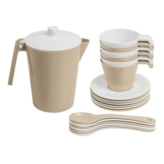 Serwis kawowy z serii Toys in Trends w kolorach jasnego beżu, mlecznej szarości oraz bieli to niezastąpiona zabawka dla każdego dziecka, które lubi bawić się w odgrywanie ról. Idealnie nadaje się na kameralne spotkanie na herbatkę dla 6 osób, a mała gospodyni będzie mogła w zabawny sposób nauczyć się zasad etykiety i nakrycia stołu. Zestaw składa się z 19 elementów: dzbanka, 6 filiżanek, 6 talerzyków, 6 łyżeczek. Zestaw jest starannie wykończony i bezpieczny w użytkowaniu - naczynia są dopuszczone do kontaktu z żywnością, można używać ich w kuchence mikrofalowej i myć w zmywarce.