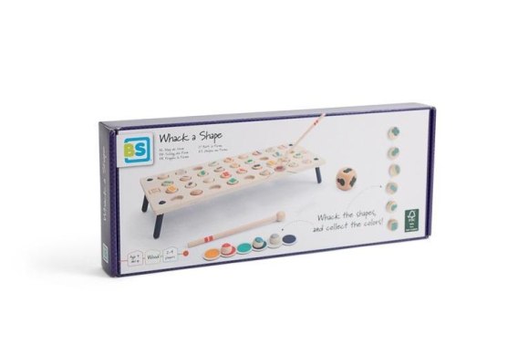 Gra przebijanka kształty i kolory to zabawa dla graczy lubiących szybkość i mogących wykazać się spostrzegawczością. Zadaniem graczy jest zebranie wszystkich kolorów na swojej karcie. Jak to zrobić? To proste: Każdy z graczy otrzymuje kartę i młotek. Następnie jeden z graczy rzuca kostką (6 różnych symboli) . Zadaniem z graczy jest uderzenia młotkiem w żeton z takim właśnie kształtem, do momentu aż żeton wypadnie z tablicy. Kolor dowolny. Musisz być pierwszy, bo tylko najszybszy gracz może zabrać uderzony żeton i ułożyć go na swojej karcie. Grę wygrywa gracz, który jako pierwszy uzupełni kartę żetonami.