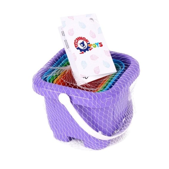 Klasyczna zabawka dla dzieci. Nowe piramidy w kolorach tęczy. Osobliwością tej zabawki jest to, że wszystkie formy można włożyć do kwadratowego wiadra z rączką. Łatwo więc przenosić zabawkę, zabrać ją na spacer, do piaskownicy czy do przedszkola.