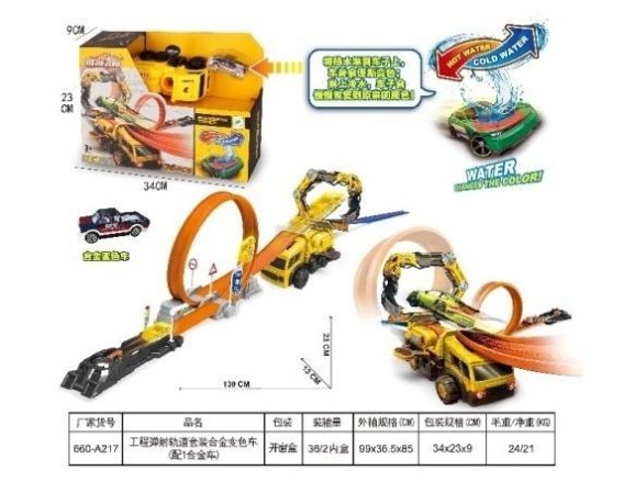 Tor z wyrzutnią o długości 130cm, posiadający auto które po zetknięciu z ciepła/zimną wodą zmienia kolor