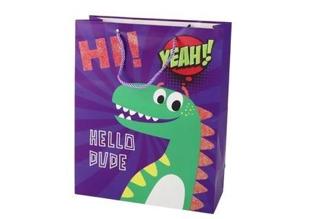 Papierowa Torba Prezentowa Fioletowa Dinozaur 41,5cm x 30cm x 12cm Ta torba prezentowa jest niezwykle urocza i przyciągająca uwagę dzięki swojemu motywowi dinozaura. Jej główny kolor to fioletowy, co nadaje jej elegancji, a dodatek brokatu dodaje jej błysku. Motyw dinozaura nadaje torbie zabawnego i przyjaznego charakteru, co sprawia, że staje się ona nietypowym dodatkiem do tradycyjnego opakowania prezentów. Bez wątpienia taka torba zmotywuje i ucieszy osobę, która otrzyma prezent w niej zapakowany. To doskonały sposób na dodanie nieco uroku i oryginalności do każdego podarunku. Torba ma idealne rozmiary do zapakowania prezentu - mierzy 41,5 cm x 30 cm x 12 cm. To sprawia, że jest odpowiednia dla różnorodnych prezentów, niezależnie od ich kształtu czy wielkości. Dzięki tym wymiarom, torba prezentowa zapewnia także wystarczającą przestrzeń, aby pomieścić dodatkowe ozdoby, kartkę świąteczną czy inne elementy dekoracyjne, które chciałbyś dołączyć do prezentu. Wymiary torby: 41,5 cm x 30 cm x 12cm