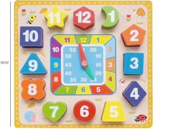 Zegar edukacyjny to idealna zabawka wspierająca wszechstronny rozwój dziecka. Ta drewniana tablica łączy funkcje tradycyjnego zegara, układanki geometrycznej i pomocnika do nauki liczenia. Dwanaście kolorowych klocków w różnych kształtach, takich jak gwiazda, trójkąt, kwadrat czy pięciokąt, należy dopasować do odpowiednich miejsc na tablicy. Każdy klocek ma nadrukowaną cyfrę od jednego do dwunastu, a różne kolory ułatwiają rozpoznawanie i zapamiętywanie. Ruchome wskazówki pozwalają na praktyczną naukę odczytywania godzin. Zegar ma wyraźnie zaznaczone minuty i godziny w różnych strefach kolorystycznych, co ułatwia zrozumienie pojęcia czasu. Układanie klocków ćwiczy motorykę małą i koordynację ręka-oko. Oprócz wartości edukacyjnej, zabawka jest estetycznie wykonana i ozdobiona uroczymi ilustracjami zwierząt i roślin, co zachęca do zabawy. To doskonały wybór dla rodziców szukających wysokiej jakości, bezpiecznych i rozwijających zabawek dla swoich pociech.