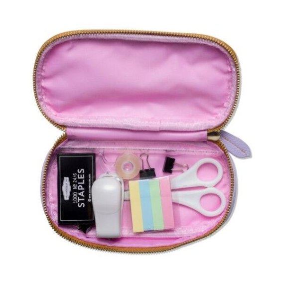 Zestaw zawiera linijkę, mini zszywacz, małe pudełko zapasowe zszywek, mini dyspenser do taśmy, nożyczki, spinacze do segregatorów i znaczniki do stron, a wszystko to zapakowane w miękkie, designerskie etui z wegańskiej skóry. Dodatkowo pokrowiec posiada elastyczną opaskę, która może pomieścić telefon, więc teraz naprawdę masz wszystko, czego potrzebujesz.