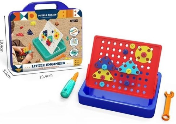 Rozwijaj kreatywność i umiejętności techniczne swojego dziecka z zestawem Mały Inżynier. To edukacyjna mozaika śrubowa 2D/3D z serii Puzzle Series, zaprojektowana z myślą o maluchach od 3 roku życia. Zestaw składa się z solidnej, czerwono-niebieskiej tablicy z perforacją, którą można ustawić pod kątem w podstawce pełniącej funkcję pojemnika na elementy. Dziecko ma do dyspozycji kolorowe, geometryczne kształty z otworami, a także plastikowe śruby, które mocuje do tablicy za pomocą dołączonego wkrętaka i klucza. Ta wciągająca zabawa w montowanie i demontowanie nie tylko dostarcza rozrywki, ale przede wszystkim wspomaga rozwój motoryki małej, precyzji ruchów oraz uczy podstaw inżynierii i logicznego myślenia. Dzięki różnorodnym kształtom i kolorom, dziecko może tworzyć niepowtarzalne płaskie lub przestrzenne konstrukcje i wzory. Kompaktowe wymiary opakowania (ok. 19,4 x 19,4 x 3,2 cm) sprawiają, że zestaw jest łatwy do przechowywania i idealny do zabrania w podróż. Wszystkie elementy są bezpieczne i dostosowane do małych rączek. W zestawie znajdują się: tablica montażowa, podstawka/pojemnik, śruby, kolorowe elementy mozaiki, wkrętak oraz klucz.