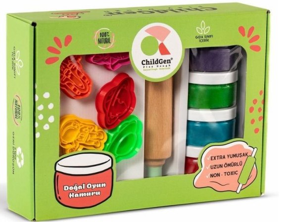 4 kolory ciastoliny (fioletowy, zielony, niebieski i czerwony) wykonanej z wyłącznie naturalnych składników,